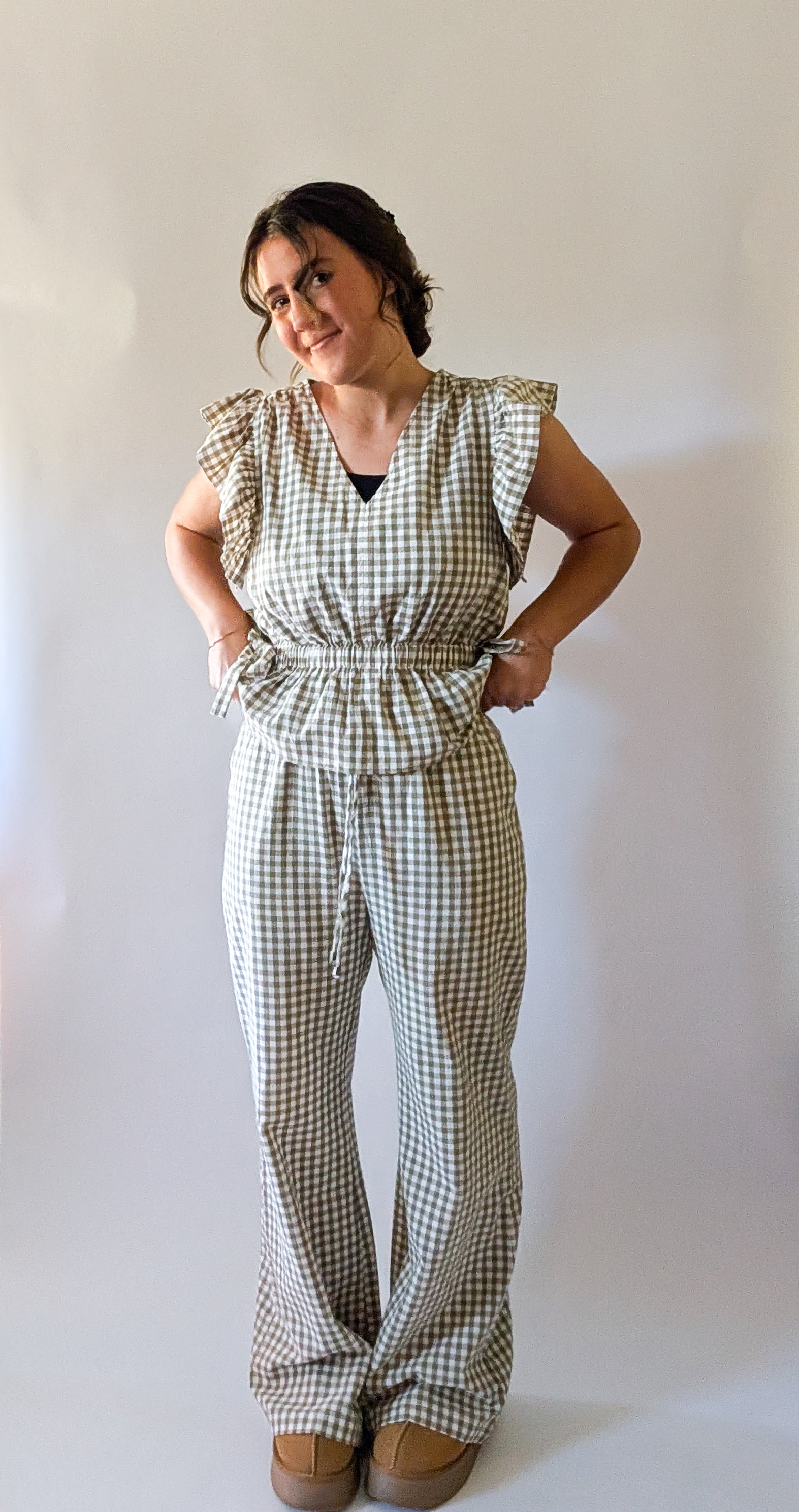 The Portland gingham pants have a classic gingham pattern in a stylish, wide-leg silhouette. Comfortable elastic waistband and tie for a flexible, flattering fit, handy side pockets for everyday convenience plus a flair pant leg and full-length inseam for a laid-back, contemporary look