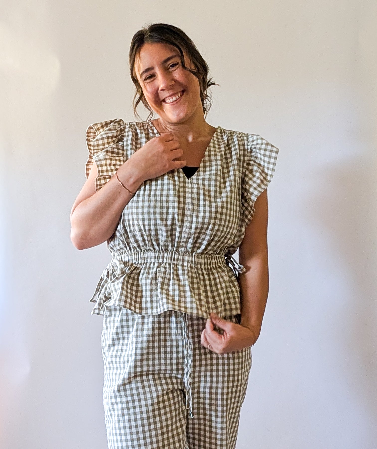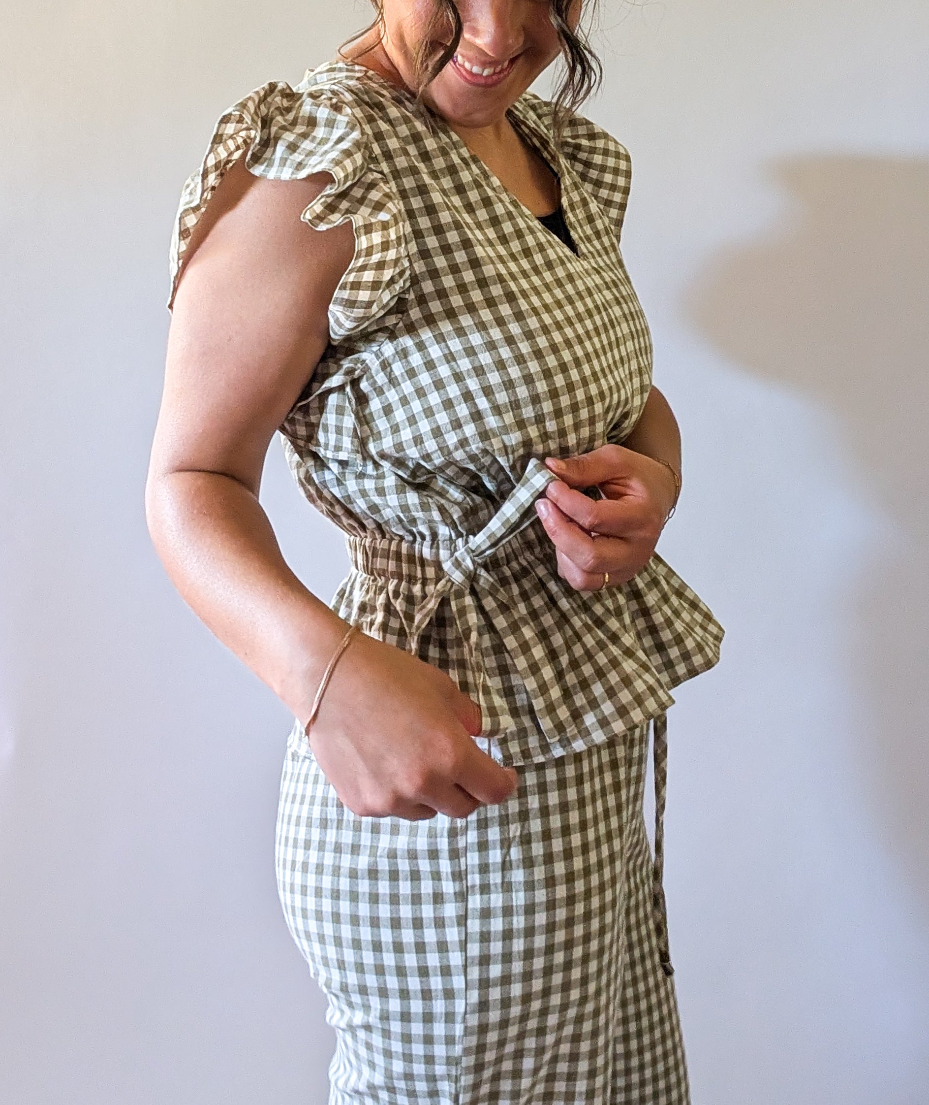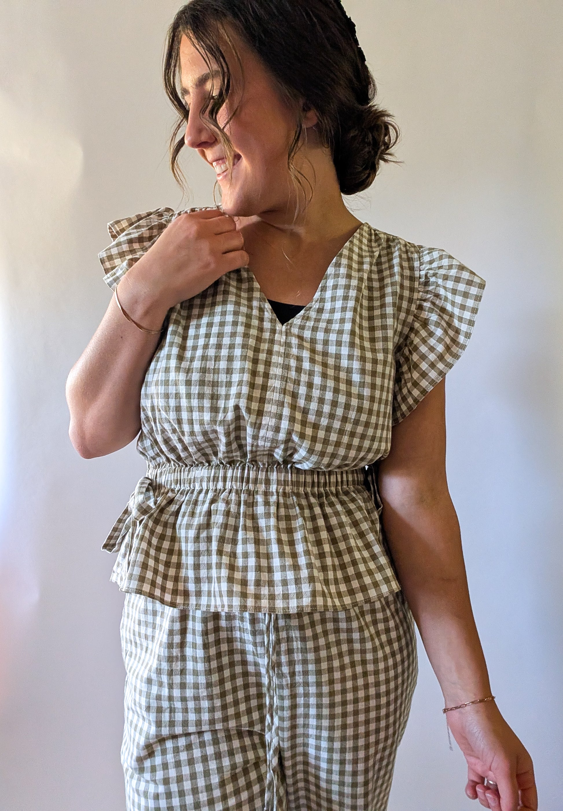 The Portland top is a flattering peplum silhouette with an elastic waist for a tailored fit, side tie at the waist for added style, cutie ruffle sleeves add a touch of volume and feminine charm & a stylish gingham pattern in the perfect shade of olive.